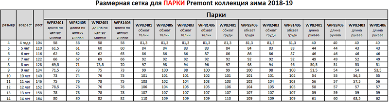 Здесь вы найдете размерные сетки Premont и Mazima. Размерная сетка Monty совпадает с размерной сеткой Premont.